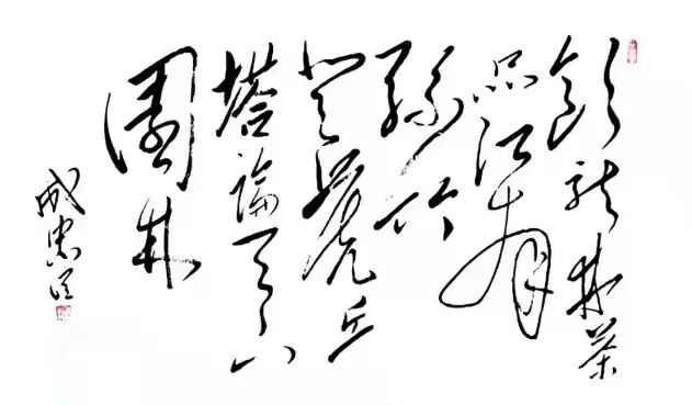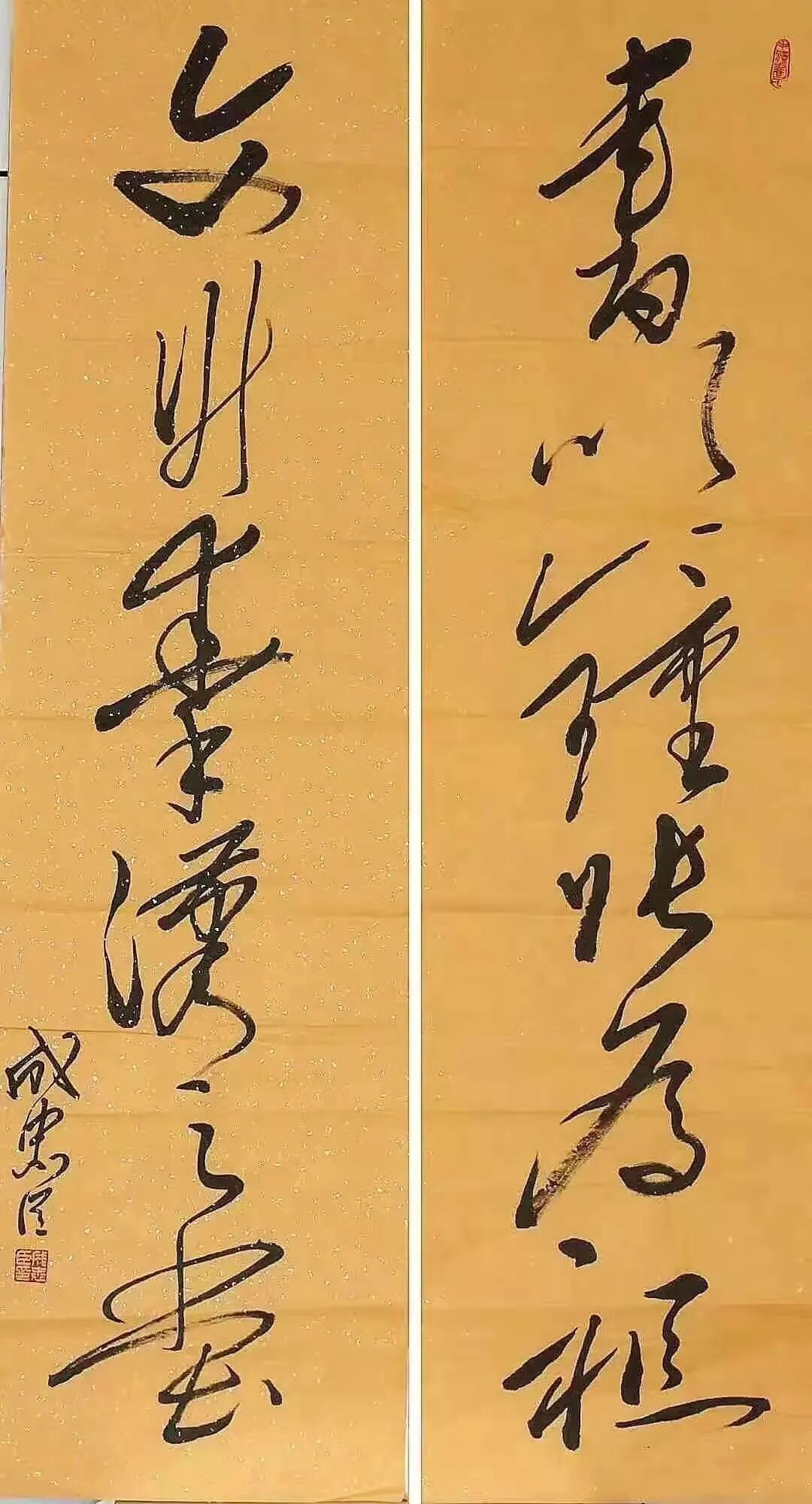 到了唐代,由于上层社会崇尚道教,使道教得以迅速发展,社会上道教的流行,必然给书法带来重大影响。许多政治家,大书家都崇尚道教,道教书法对草书的影响更为直接。信仰道教的大书家张旭,他的狂草艺术直接受益于道教,宇宙论和狂奔宣泄的道教符篆,至宋代苏东坡、黄庭坚等人的书法艺术都是从道教中受到启迪。 △成忠臣书法作品